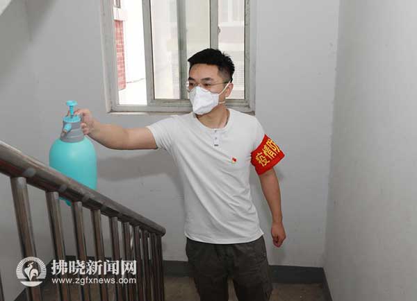 黨員志愿者定期對小區(qū)樓道及公共區(qū)域進(jìn)行消殺。吳天元 攝