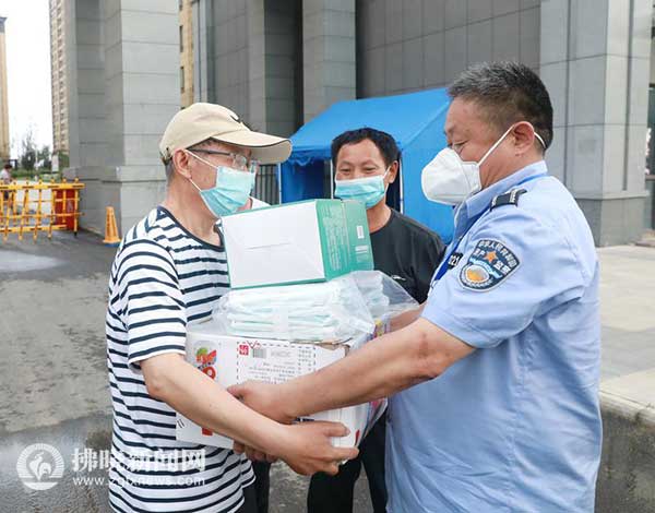 泗縣房管部門的工作人員向小區(qū)疫情防控志愿者贈送防疫物資。吳天元 攝