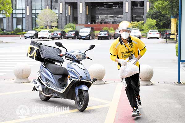 7月5日,譚章夢為顧客配送訂單。今年27歲的譚章夢是安徽省宿州市泗縣的一名外賣小哥。泗縣本輪新冠肺炎疫情發(fā)生后,譚章夢主動向公司申請加入物資保供組,忙碌在疫情防控一線,為一家大型保供商超提供配送服務(wù),保障米面蔬菜等生活必需物資的配送。接單、取貨、送貨,譚章夢穿梭于大街小巷,一天工作約12個(gè)小時(shí)。“泗縣是我的家鄉(xiāng),我想為家鄉(xiāng)作點(diǎn)貢獻(xiàn),為物資保供出份力。”譚章夢說。 新華社 發(fā)