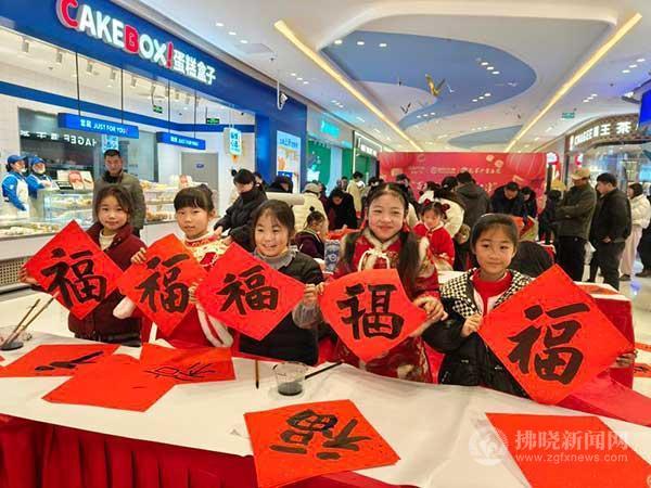 1月19日,小朋友們?cè)谒蕹俏釔倧V場(chǎng)為市民書(shū)寫(xiě)“福”字。