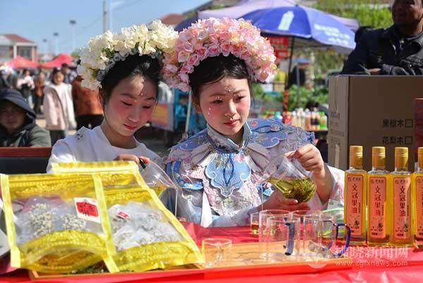 4月13日,埇橋區蒿溝鎮尹樓村,頭上簪花的女孩在推介文冠果茶。文冠果渾身是寶,果葉可以制作綠茶、紅茶和黑茶,花可以制藥,果實可以榨油。尹樓村積極打造3000畝文冠果樹園,對文冠果進行深加工,同時發展鄉村旅游,促進一二三產融合發展,使文冠果成為推動當地群眾增收致富的特色產業。特約攝影 張從本