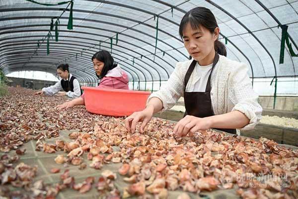 5月8日,工人在碭山縣玄廟鎮梨花村野居菌菇種植基地忙著晾曬“貴妃木耳”。