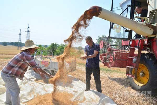 5月25日,埇橋區曹村鎮尚橋村農民從收割機上卸下剛收獲的麥粒。目前,我市小麥陸續進入成熟期,廣大農民抓住當前晴好天氣,做到成熟一塊、收割一塊,確保顆粒歸倉。特約攝影 張從本