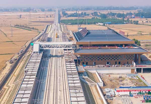 5月29日,航拍合新高鐵泗縣東站施工現場。備受矚目的泗縣東站目前已基本竣工。該站位于泗縣草廟鎮境內,站場規模為兩臺四線,站房面積約1.2萬平方米,外觀風格充分融入了“隋唐古韻、運河新風”元素。該站建成運營后,將極大便利泗縣及周邊地區居民的出行,對促進區域經濟社會協調發展、深度融入長三角具有重要意義。 記者 馬峰 蘇洋 攝