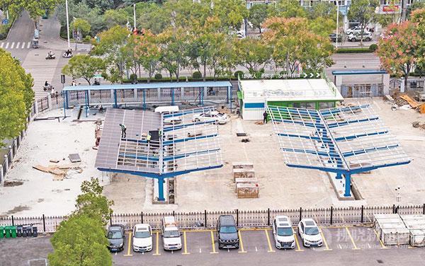 10月19日,航拍正在施工中的宿城迎賓大道和淮海路交叉口東北角新能源汽車充電停車場。今年以來,我市通過盤活城區(qū)邊角地塊新建停車場、增加新能源停車泊位等舉措擴容增量,有效緩解市民“停車難,充電煩”的困擾。目前,全市新增公共停車泊位近2800個,城市停車泊位達3.1萬余個。