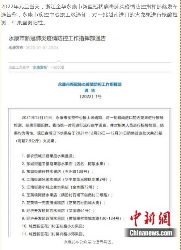 2022年元旦當天,浙江金華永康市新型冠狀病毒肺炎疫情防控指揮部就發布通告稱,永康市疾控中心接上級通知,對一批越南進口的火龍果進行核酸檢測,結果呈弱陽性。