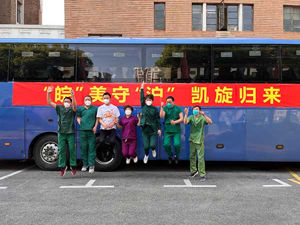 當日早晨,在上海錦江飯店,安徽部分核酸采樣隊伍在這里裝點行囊,準備啟程返皖。澎湃新聞記者在現場看到,酒店門口停著兩輛大巴車,上掛“‘皖’美守‘滬’凱旋歸來”的橫幅,醫護人員們在橫幅前或是比心,或是跳躍,擺出各種姿勢,抓緊時間一起合影留念。