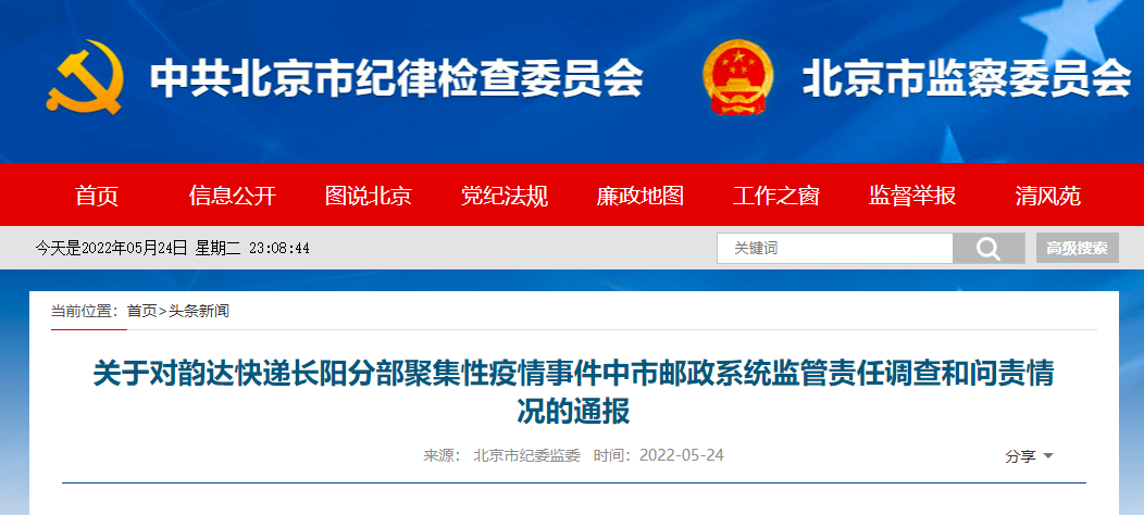 2022年5月,韻達(dá)快遞長陽分部發(fā)生聚集性疫情,經(jīng)與中央紀(jì)委國家監(jiān)委駐交通運輸部紀(jì)檢監(jiān)察組協(xié)商,北京市紀(jì)委監(jiān)委對疫情傳播擴(kuò)散過程中涉及的監(jiān)管責(zé)任開展調(diào)查,現(xiàn)將調(diào)查和處理情況通報如下: