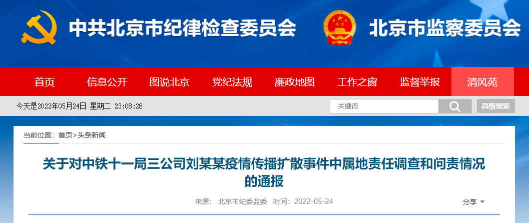 2022年5月,中鐵十一局三公司發(fā)生聚集性疫情并傳播擴(kuò)散,北京市紀(jì)委監(jiān)委組織工作專班對疫情傳播擴(kuò)散事件中屬地責(zé)任開展調(diào)查,涉及房山區(qū)、海淀區(qū)、大興區(qū)相關(guān)單位及人員,現(xiàn)將調(diào)查和處理情況通報如下: