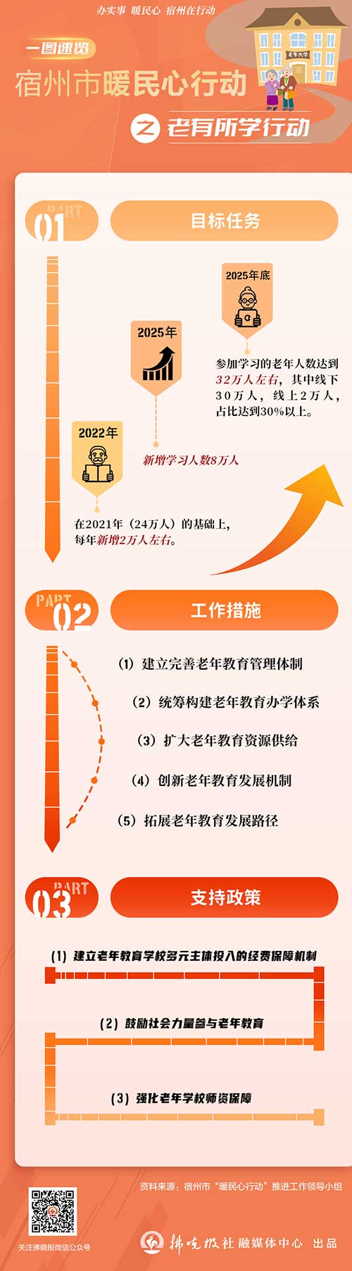 拂曉新聞網(wǎng)--拂曉報訊 6月28日下午,我市舉行“辦實(shí)事 暖民心 宿州在行動”系列新聞發(fā)布會(第九場),介紹《老有所學(xué)行動實(shí)施方案》(以下簡稱《方案》)有關(guān)情況。《方案》明確,我市在2021年老有所學(xué)24萬學(xué)習(xí)人數(shù)的基礎(chǔ)上,從2022年起每年新增2萬人左右,至2025年底參加學(xué)習(xí)的老年人數(shù)達(dá)到32萬人左右,其中線下30萬人、線上2萬人,占比達(dá)到30%以上。