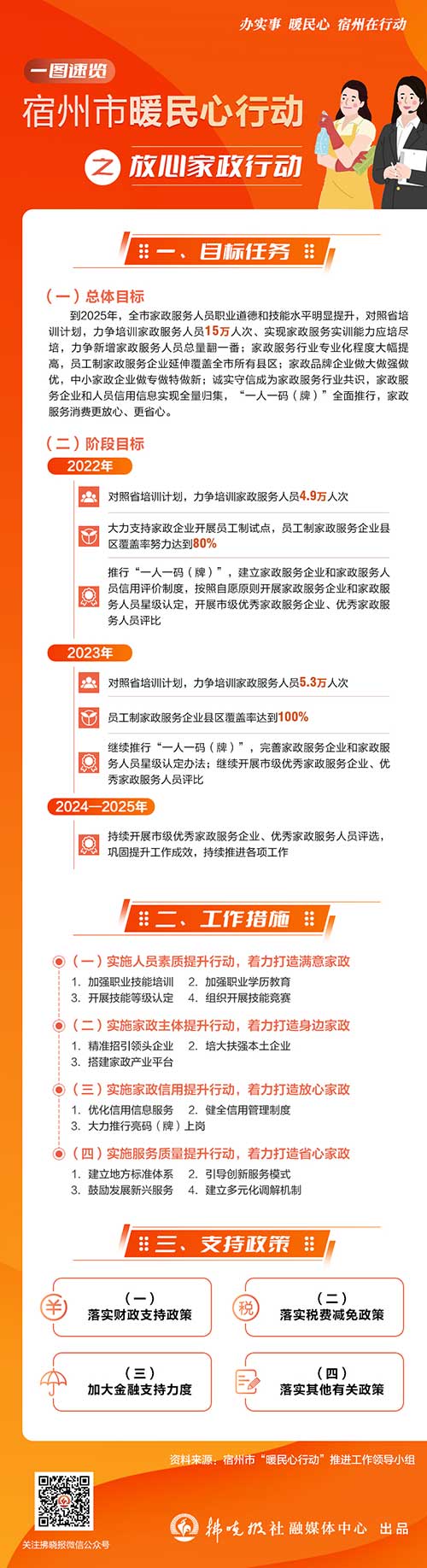 “在省、市十大暖民心行動(dòng)啟動(dòng)后,市商務(wù)局高度重視、立即行動(dòng),聚焦家政服務(wù)業(yè)‘提質(zhì)、擴(kuò)容’,牽頭起草了《宿州市放心家政實(shí)施方案》。”李云英介紹,《方案》主要包括1個(gè)總體目標(biāo)和3個(gè)階段目標(biāo)。其中,1個(gè)總體目標(biāo)是指,到2025年,全市家政服務(wù)人員職業(yè)道德和技能水平明顯提升,對(duì)照省培訓(xùn)計(jì)劃,力爭(zhēng)培訓(xùn)家政服務(wù)人員15萬(wàn)人次、實(shí)現(xiàn)家政服務(wù)實(shí)訓(xùn)能力應(yīng)培盡培,力爭(zhēng)新增家政服務(wù)人員總量翻一番;家政服務(wù)行業(yè)專業(yè)化程度大幅提高,員工制家政服務(wù)企業(yè)延伸覆蓋全市所有縣區(qū);家政品牌企業(yè)做大做強(qiáng)做優(yōu),中小家政企業(yè)做專做特做新;誠(chéng)實(shí)守信成為家政服務(wù)行業(yè)共識(shí),家政服務(wù)企業(yè)和人員信用信息實(shí)現(xiàn)全量歸集,“一人一碼(牌)”全面推行,家政服務(wù)消費(fèi)更放心、更省心。3個(gè)階段目標(biāo),一是在2022年,對(duì)照省培訓(xùn)計(jì)劃,力爭(zhēng)培訓(xùn)家政服務(wù)人員4.9萬(wàn)人次;大力支持家政企業(yè)開展員工制試點(diǎn),員工制家政服務(wù)企業(yè)縣區(qū)覆蓋率努力達(dá)到80%;推行“一人一碼(牌)”,建立家政服務(wù)企業(yè)和家政服務(wù)人員信用評(píng)價(jià)制度,按照自愿原則開展家政服務(wù)企業(yè)和家政服務(wù)人員星級(jí)認(rèn)定,開展市級(jí)優(yōu)秀家政服務(wù)企業(yè)、優(yōu)秀家政服務(wù)人員評(píng)比。二是在2023年,對(duì)照省培訓(xùn)計(jì)劃,力爭(zhēng)培訓(xùn)家政服務(wù)人員5.3萬(wàn)人次;員工制家政服務(wù)企業(yè)縣區(qū)覆蓋率達(dá)到100%;繼續(xù)推行“一人一碼(牌)”,完善家政服務(wù)企業(yè)和家政服務(wù)人員星級(jí)認(rèn)定辦法;繼續(xù)開展市級(jí)優(yōu)秀家政服務(wù)企業(yè)、優(yōu)秀家政服務(wù)人員評(píng)比。三是在2024—2025年,持續(xù)開展市級(jí)優(yōu)秀家政服務(wù)企業(yè)、優(yōu)秀家政服務(wù)人員評(píng)選,鞏固提升工作成效,持續(xù)推進(jìn)各項(xiàng)工作。