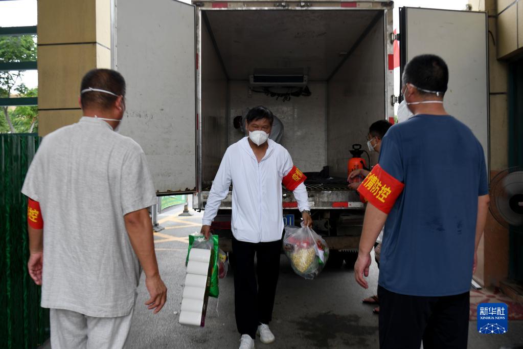 7月4日,泗縣玉蘭小區(qū)工作人員接收居民的訂單物資。