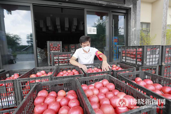 7月7日,在泗縣丹鳳路,當?shù)刂驹刚哒诜謷b運埇橋區(qū)順河鎮(zhèn)馬場村菜農(nóng)捐贈的西紅柿。