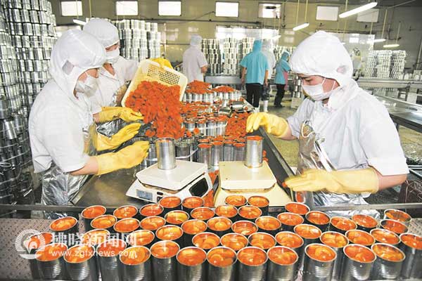 碭山縣興達食品有限公司工人正在加緊生產(chǎn)黃桃罐頭,趕制訂單。