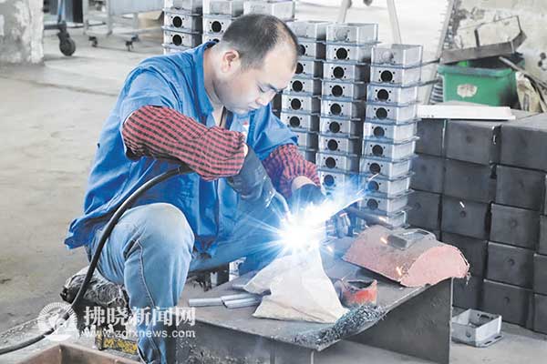 埇橋區恒泰電氣有限公司電焊職工正在忙生產。 特約攝影 張成伍