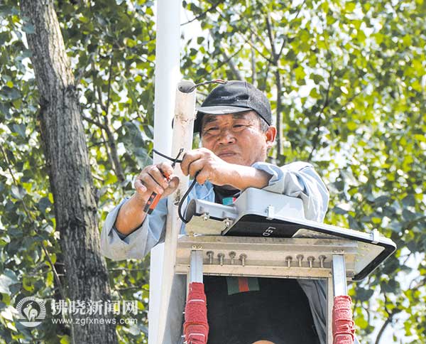 埇橋區時村鎮施工隊冒酷暑對各村損毀路燈進行維修。 特約攝影 李華勛