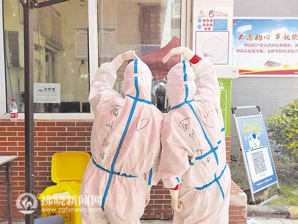 六安市霍山縣支援埇橋區(qū)醫(yī)療隊隊員夏云和蘇丹在抗疫間隙為宿州加油。 記者 劉春艷 付雪芹 攝