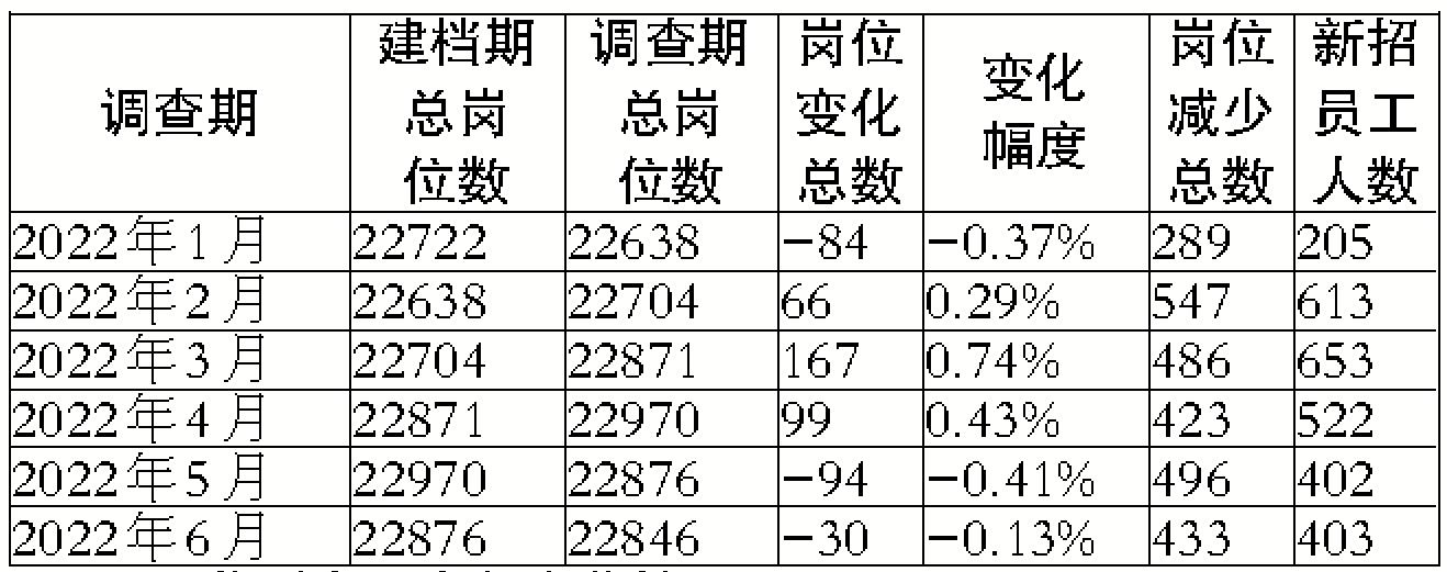 2022年1月-6月,我市60家監測企業就業人數新增2798人, 減少2674人,增減相抵后較建檔期22722人凈增124人,增幅為0.55%(見下表)。