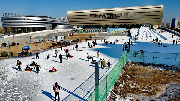 宿州體育館滑雪場(chǎng)一片歡聲笑語(yǔ)。 特約攝影 張成伍