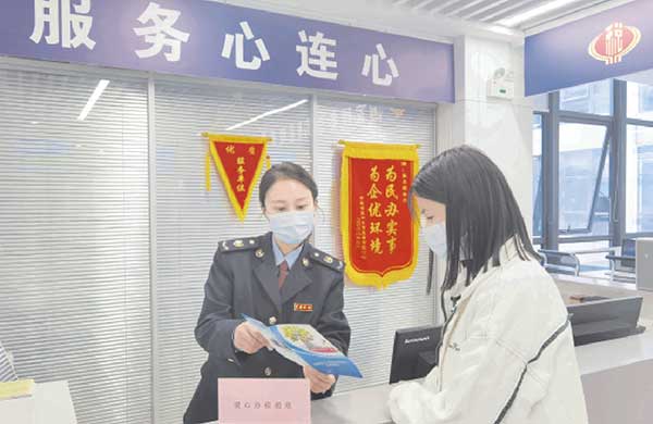 3月21日,蕭縣政務(wù)服務(wù)中心“愛心辦稅”通道的工作人員向前來辦理業(yè)務(wù)的群眾宣傳相關(guān)減稅政策。 張祖北 攝