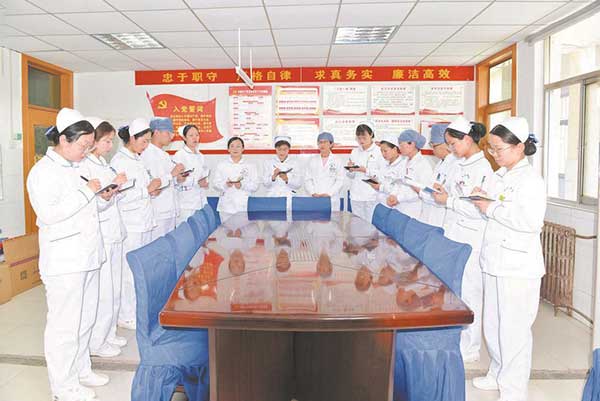 “××床下肢栓塞,交班護士要交代家人不要拍打下肢……”早上7點半,市立醫院南區感染科進行早交班。夜班醫護值班人員對病區患者病情進行交接,護士長劉湘云對護理交班內容進行點評及重點工作提醒,護士們認真記錄??浦魅慰偨Y并交代注意事項。會后,大家各司其職,抽血、配藥、輸液……開始了一天忙碌的工作。