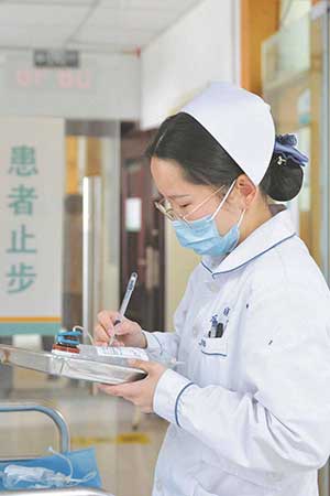 護士劉夢雅準備為患者輸液。