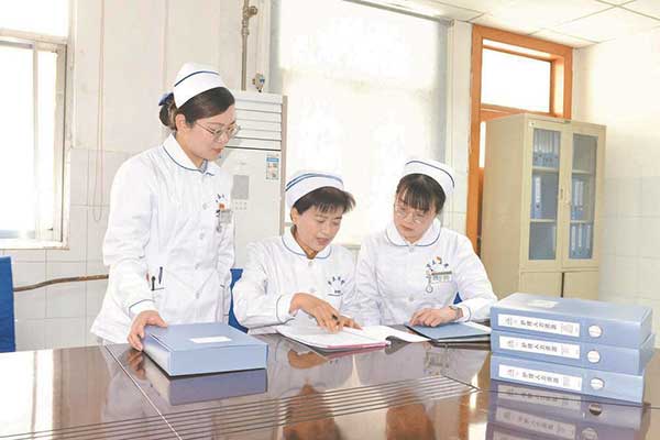 護士長劉湘云(中)對副護士長肖娜(左)、魏紫薇(右)日常工作進行督查指導。