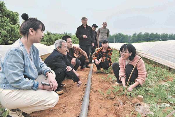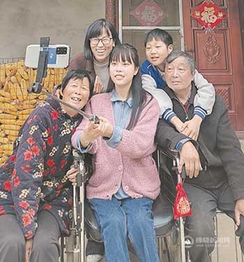 與在外打工的丈夫連線,報(bào)告家人平安。