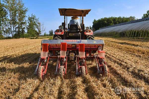 碭山縣周寨鎮張老家村收割完的麥田里,農機手和農民一起把玉米種子倒進播種機。