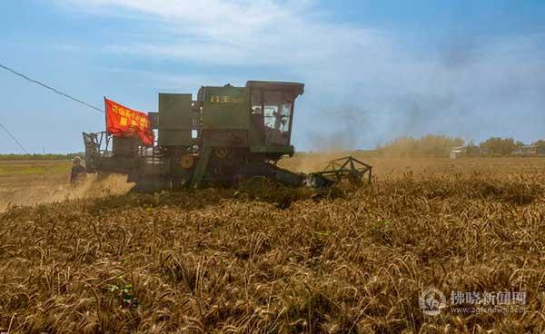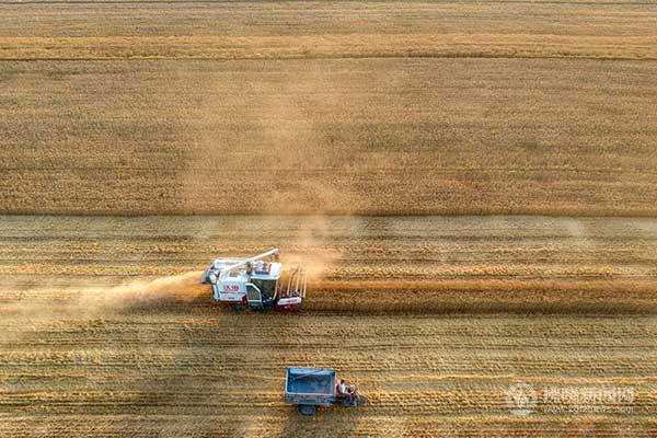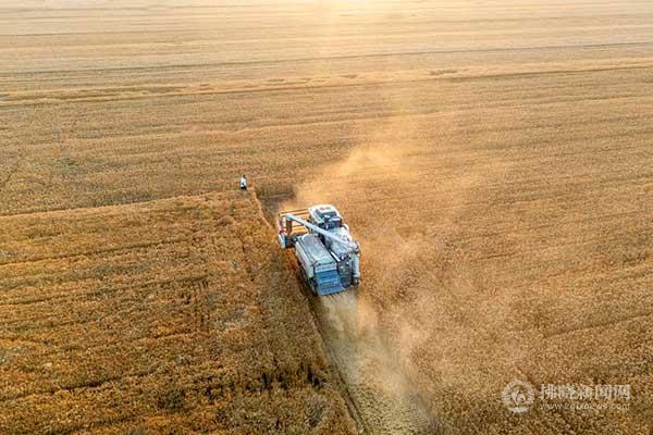 麥浪滾滾,機聲隆隆,“鐵牛”飛奔在金黃的麥田里,奏響歡快的豐收樂章。