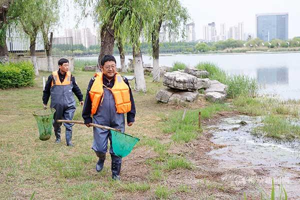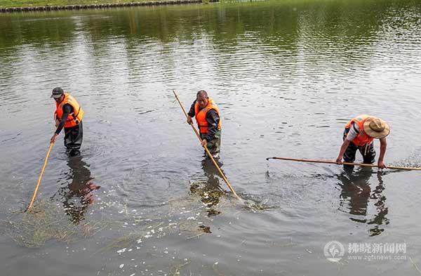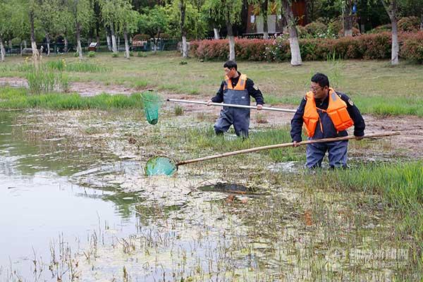 清晨6點,兩人就到達(dá)地點,麻利地穿上皮衩,帶著撈罩下湖打撈水面垃圾、綠苔及雜草等漂浮物。他們從三角洲公園南長廊沿湖堤一直行至西北土山,然后進入湖中3個島區(qū),環(huán)島入水打撈垃圾雜草等水上漂浮物。環(huán)湖堤長達(dá)6公里以上,每天站在1米多深的水中,一干就是三四個小時。