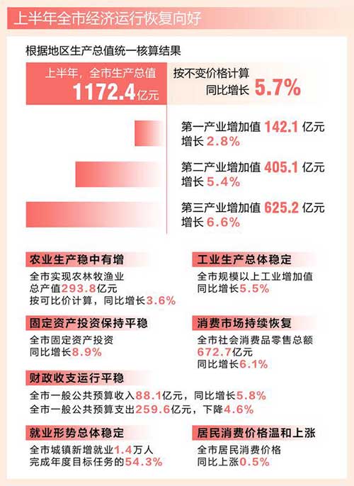 根據地區生產總值統一核算結果,上半年,全市生產總值1172.4億元,按不變價格計算,同比增長5.7%。分產業看,第一產業增加值142.1億元,增長2.8%;第二產業增加值405.1億元,增長5.4%;第三產業增加值625.2億元,增長6.6%。