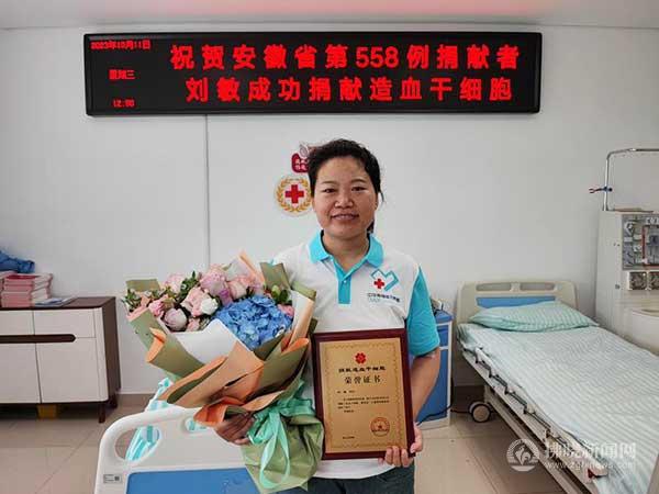 拂曉新聞網(wǎng)--拂曉報訊 10月11日,埇橋區(qū)蒿溝鎮(zhèn)衛(wèi)生院醫(yī)生劉敏,在合肥成功捐出256毫升造血干細胞混懸液,為一名陌生的血液病患者點亮生命之光。劉敏成為安徽省第558例、宿州市第41例成功捐獻造血干細胞的志愿者。