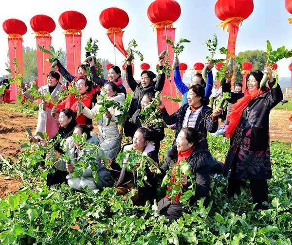 11月12日,蕭縣龍城鎮帽山村“蘿卜采收節暨品鑒觀摩會”在帽山腳下舉行。雖已入冬,但田間地頭,一片熱火朝天的景象。菜農們挖的挖、屯的屯,吆喝著搭檔配合抬放;婦女們盛裝上陣,變身“網紅達人”,站在蘿卜地里帶貨直銷,為家鄉宣傳;鎮文化站組織了簡樸而又熱烈的文藝表演,載歌載舞,慶祝蘿卜豐收;電視臺現場連線,進行助農直播;蕭縣駐北京、上海等地商會負責人也親臨收獲現場,親口嘗一嘗“彎腰青”的味道;適逢星期天,不少城市居民也帶著孩子,走進田野,體驗農耕文化的樂趣。