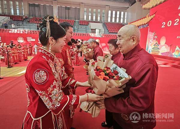 新人向六對(duì)結(jié)婚50年的“金婚夫婦”獻(xiàn)花。