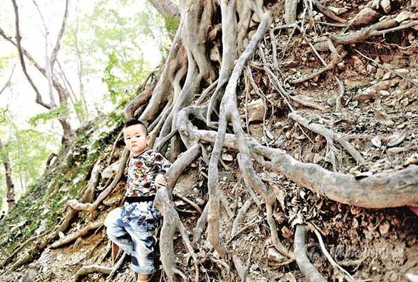 石碑馱樹:天門寺渡仙橋右側石壁上,生長著兩棵青檀古樹。這兩棵青檀奇特之處在于,一塊巨石橫插在粗大樹根的底下,看起來就像樹干基部緊緊“抱”著這塊巨石,因此,得名“青檀抱石”,又叫做“石碑馱樹”。