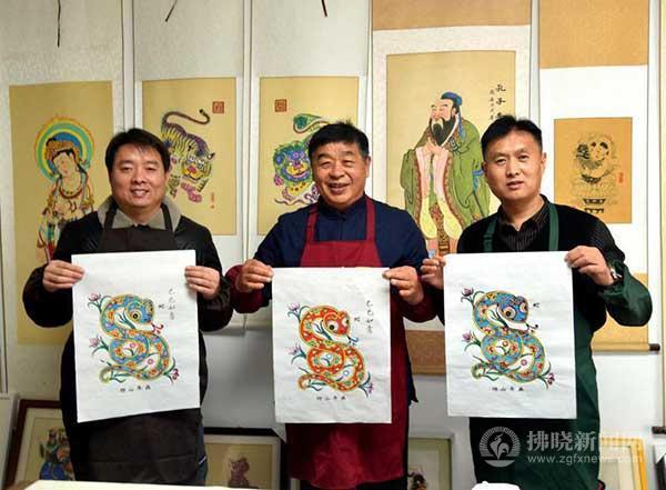 “碭山年畫”省級非遺代表性傳承人黃興橋(中)創作的蛇年年畫。
