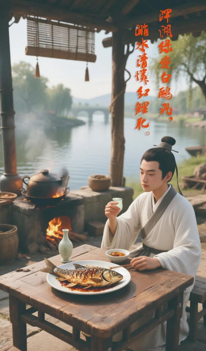 此時(shí),少年白居易或許正挎著書箱經(jīng)過渡口,他駐足看漁人從青竹魚簍倒出活蹦亂跳的收獲,那條紅鯉格外醒目。少年心動,掏出幾枚銅錢買下,隨即在東林草堂旁的河灘架石為灶,拾柴生火。河灘上升起的炊煙里,漸漸飄出蔥姜與魚香交織的云朵。