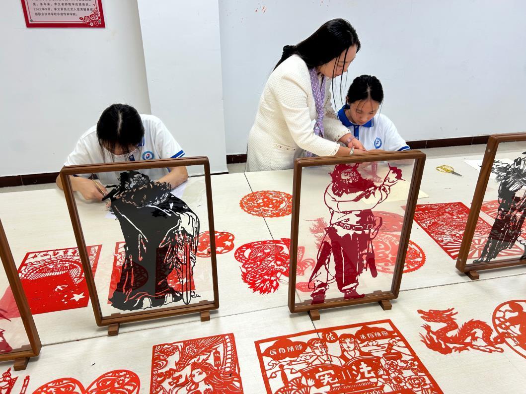 安徽靈璧縣高級職業技術學校學生在老師的指導下學習鐘馗剪紙