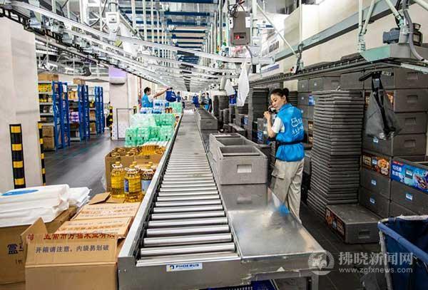 10月10日,宿州吾悅廣場盒馬鮮生員工在倉儲中心“線上+線下”智慧配送流水線作業。今年以來,我市以培育零售新業態為抓手,通過首店經濟、商文旅融合以及智慧配送等模式,不斷創新消費新場景,打造城市消費新地標,推動商貿零售業向新模式迭代升級。記者 馬峰 攝