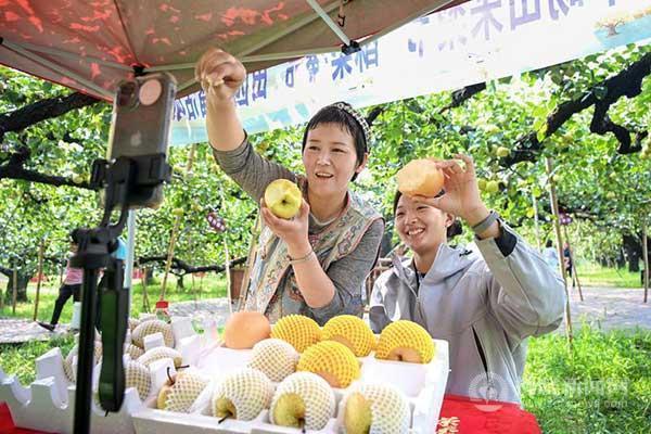 碭山采梨節(jié)活動上,梨農(nóng)張雪芝(左)通過視頻直播的方式銷售酥梨。特約攝影 崔猛