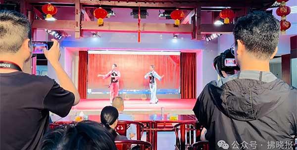 采風團記者觀看泗州戲演出并拍攝記錄