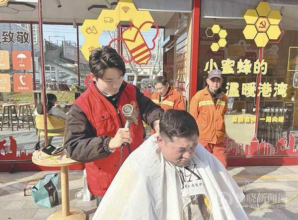 埇橋區(qū)南關街道蘇寧商圈暖“蜂”歸宿黨群驛站為新就業(yè)群體開展義剪服務。