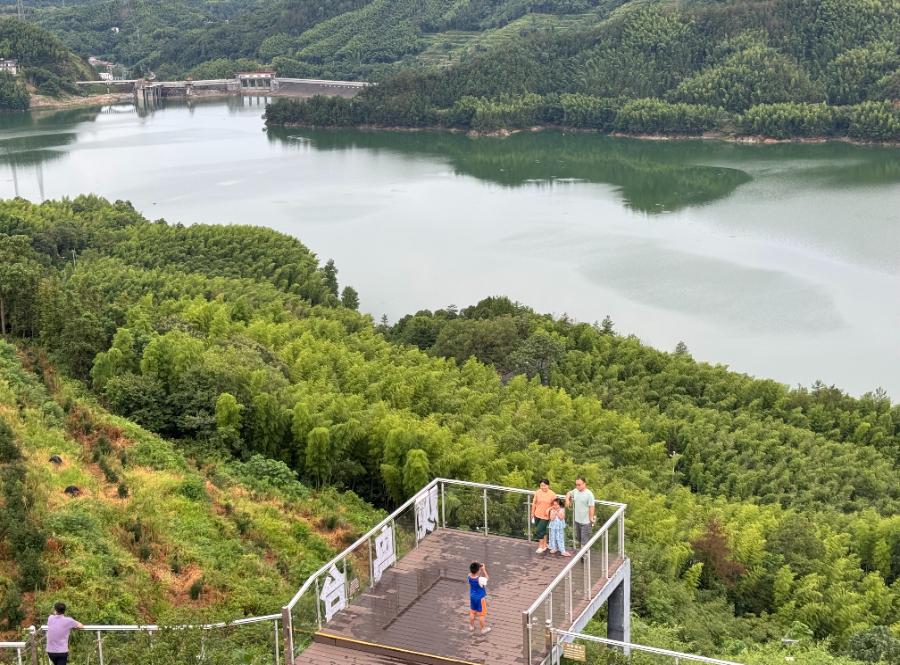 游客在廣福村觀鳥臺上合影留念,遠處是釣魚臺水庫。新華網 吳京澤 攝